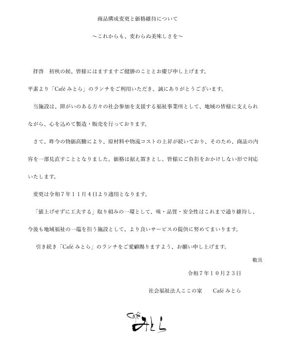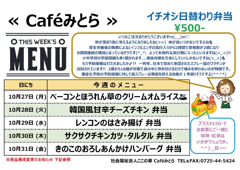 Caféみとら 10/27(月)からのメニュー