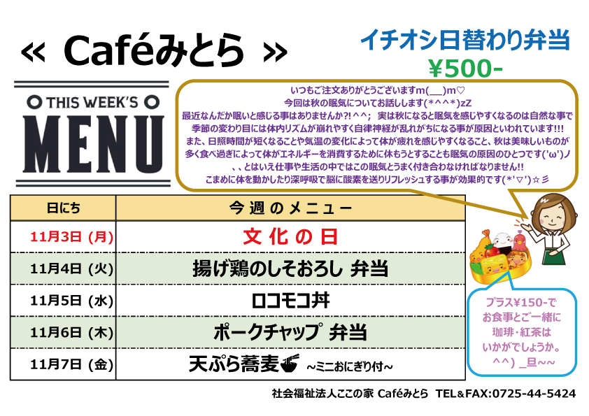 TOP > ここの家便り > Café みとら > Caféみとら イチオシ日替わり弁当(11/3~11/7)