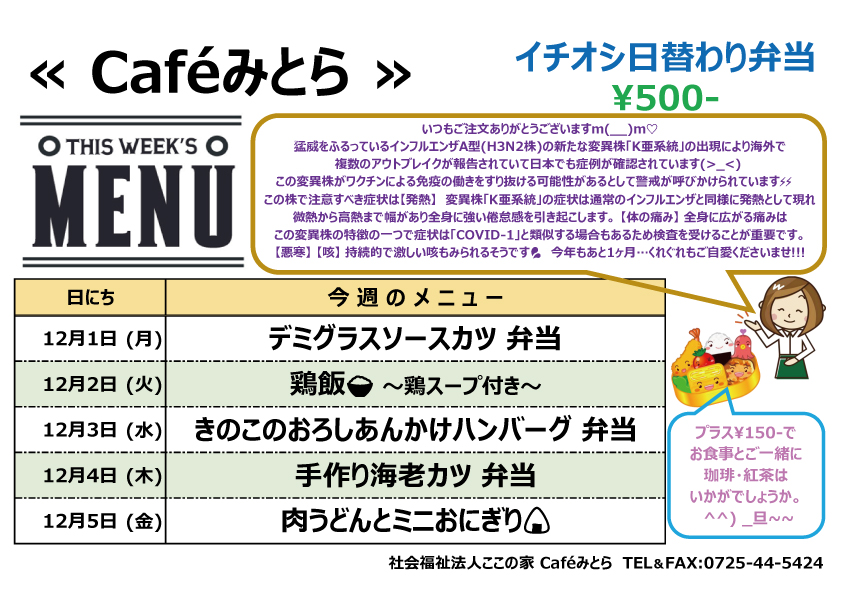 TOP > ここの家便り > Café みとら > Caféみとら イチオシ日替わり弁当(12/1~12/5)