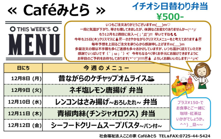 Café みとら お知らせ ここの家便り ここふる テイクアウト 第2ここの家 2025/12/4 New Caféみとら イチオシ日替わり弁当(12/8~12/12) Caféみとら 12/8(月)からのメニュー…