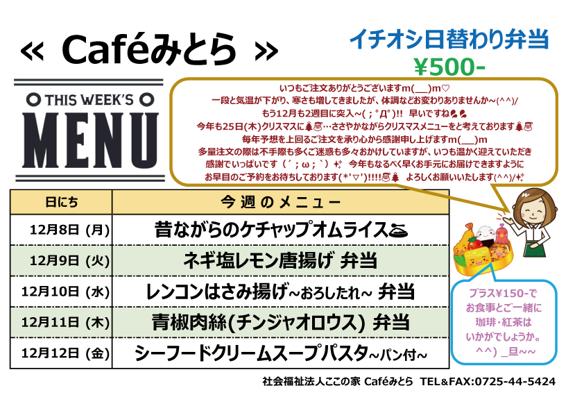 TOP > ここの家便り > Café みとら > Caféみとら イチオシ日替わり弁当(12/8~12/12)