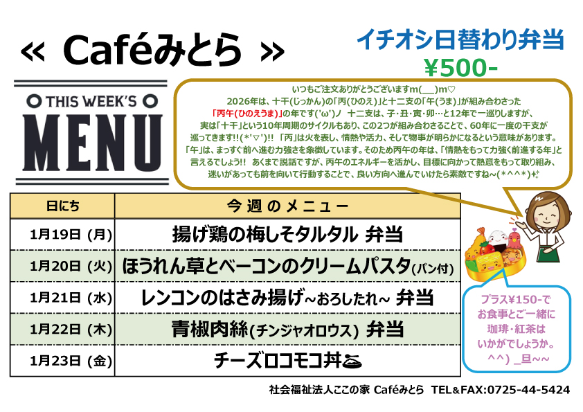 TOP > ここの家便り > Café みとら > Caféみとら イチオシ日替わり弁当(1/19~1/23)