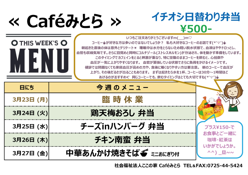 TOP > ここの家便り > Café みとら > Caféみとら イチオシ日替わり弁当(3/23~3/27)