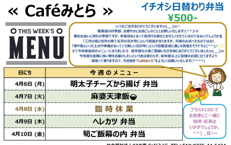 Café みとら お知らせ ここの家便り ここふる テイクアウト 第2ここの家 2026/4/2 New Caféみとら イチオシ日替わり弁当(4/6~4/10) Caféみとら 4/6(月)からのメニュー ※誠に勝手ながら4月8日(水)は臨時業とさせていただきます。 お客様にはご…