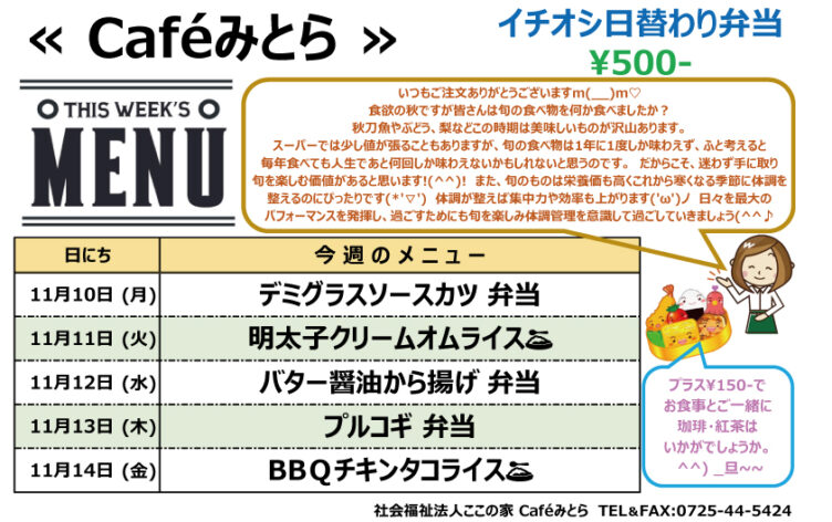 Café みとら お知らせ ここの家便り ここふる テイクアウト 第2ここの家 2025/10/30 Caféみとら イチオシ日替わり弁当(11/3~11/7) Caféみとら 11/3(月)からのメニュー…