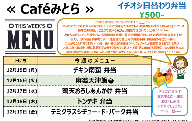 Café みとら お知らせ ここの家便り ここふる テイクアウト 第2ここの家 2025/12/11 New Caféみとら イチオシ日替わり弁当(12/15~12/19) Caféみとら 12/15(月)からのメニュー…