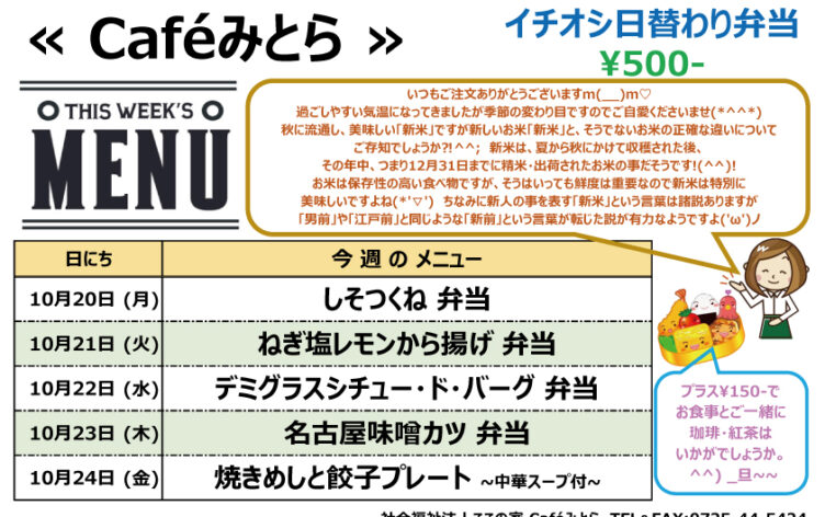 Café みとら お知らせ ここの家便り ここふる テイクアウト 第2ここの家 2025/10/16 New Caféみとら イチオシ日替わり弁当(10/20~10/24) Caféみとら 10/20(月)からのメニュー…