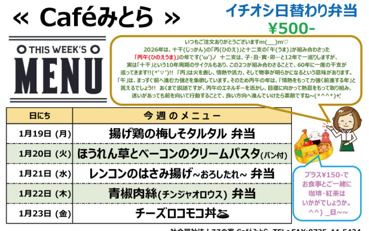 Café みとら お知らせ ここの家便り ここふる テイクアウト 第2ここの家 2026/1/15 New Caféみとら イチオシ日替わり弁当(1/19~1/23) Caféみとら 1/19(月)からのメニュー…