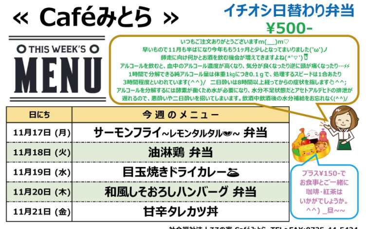 Café みとら お知らせ ここの家便り ここふる テイクアウト 第2ここの家 2025/11/13 New Caféみとら イチオシ日替わり弁当(11/17~11/21) Caféみとら 11/17(月)からのメニュー…