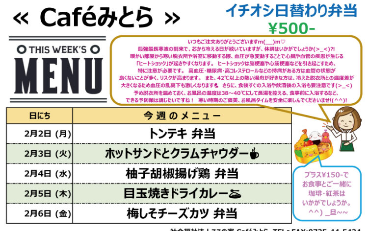 Café みとら お知らせ ここの家便り ここふる テイクアウト 第2ここの家 2026/1/29 New Caféみとら イチオシ日替わり弁当(2/2~2/6) Caféみとら 2/2(月)からのメニュー ≪ お知らせ ≫…